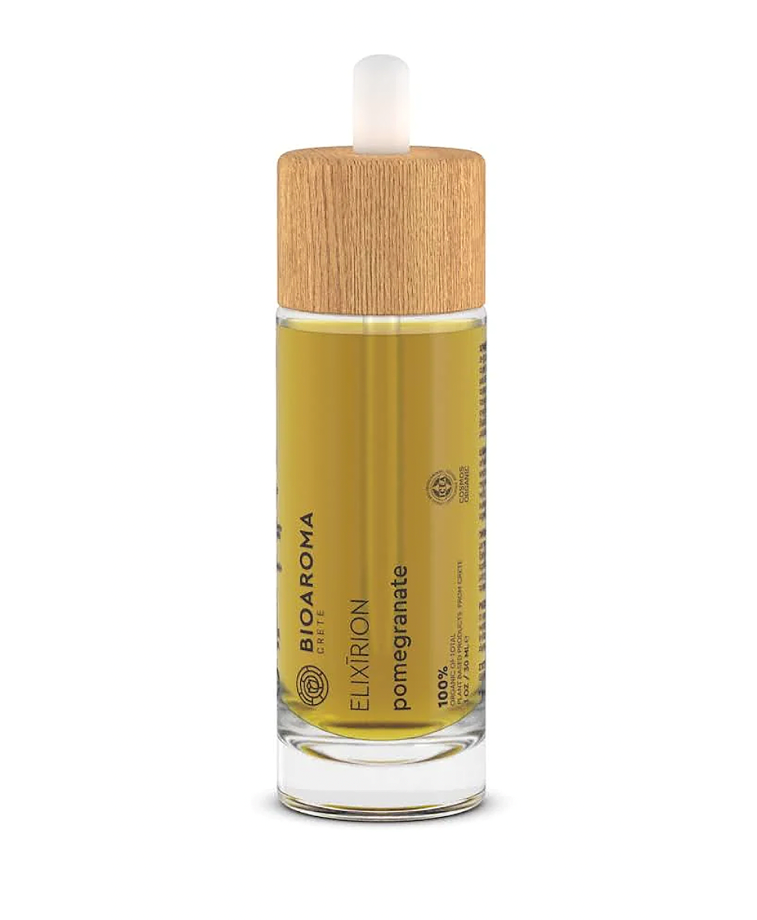 NATURE’S NECTAR One of the most sought after oils in the world. This little magical bottle of wonder regenerates the skin, neutralizes the signs of premature aging, reduces wrinkles on the skin, offers anti-inflammatory, healing, and nourishing properties. Elixirion Pomegranate Oil produced by Bioaroma Crete ($15) is extracted from the organic seeds of the fruit, which are harvested, dried, then cold-pressed.