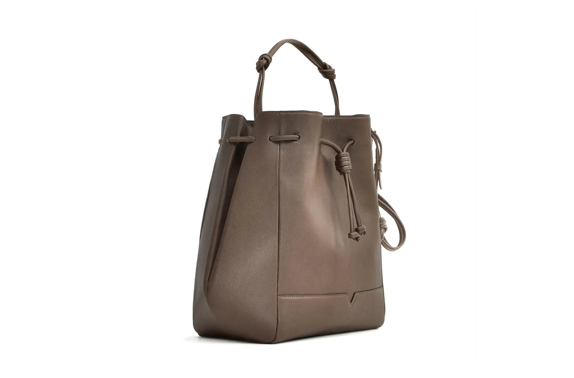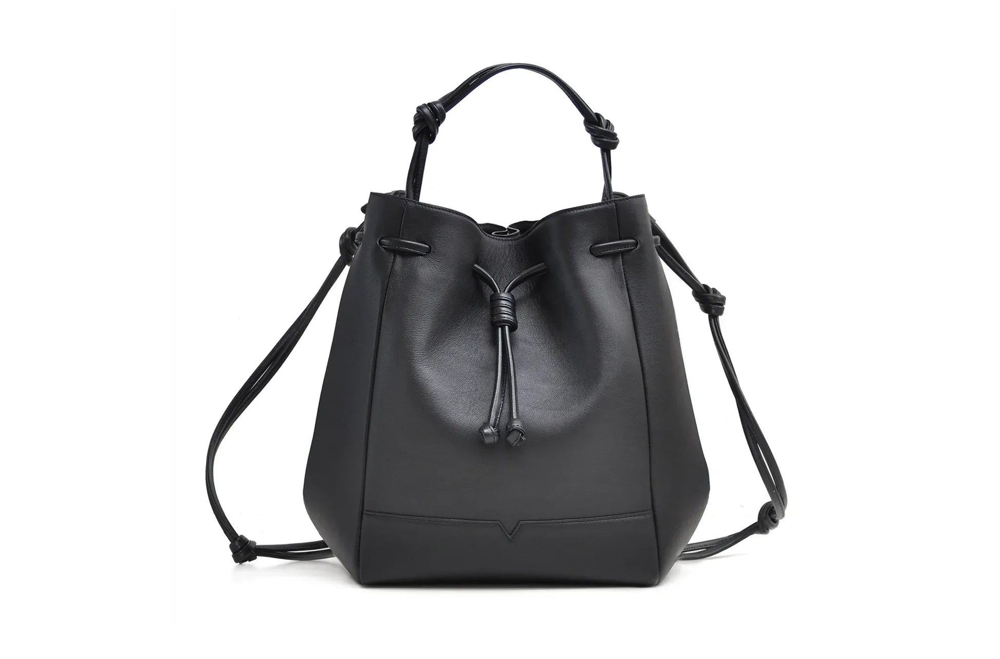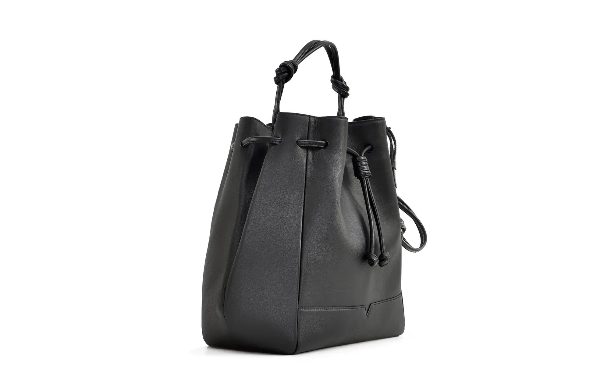 Carry on in style. The Large Bucket Bag is a functional vegan backpack that easily transforms into a refined shoulder bag or handheld. There are two open pockets inside for organization, a drawstring to cinch the top and invisible magnetic closure. It has knotted cording, our “V” graphic and removable straps.