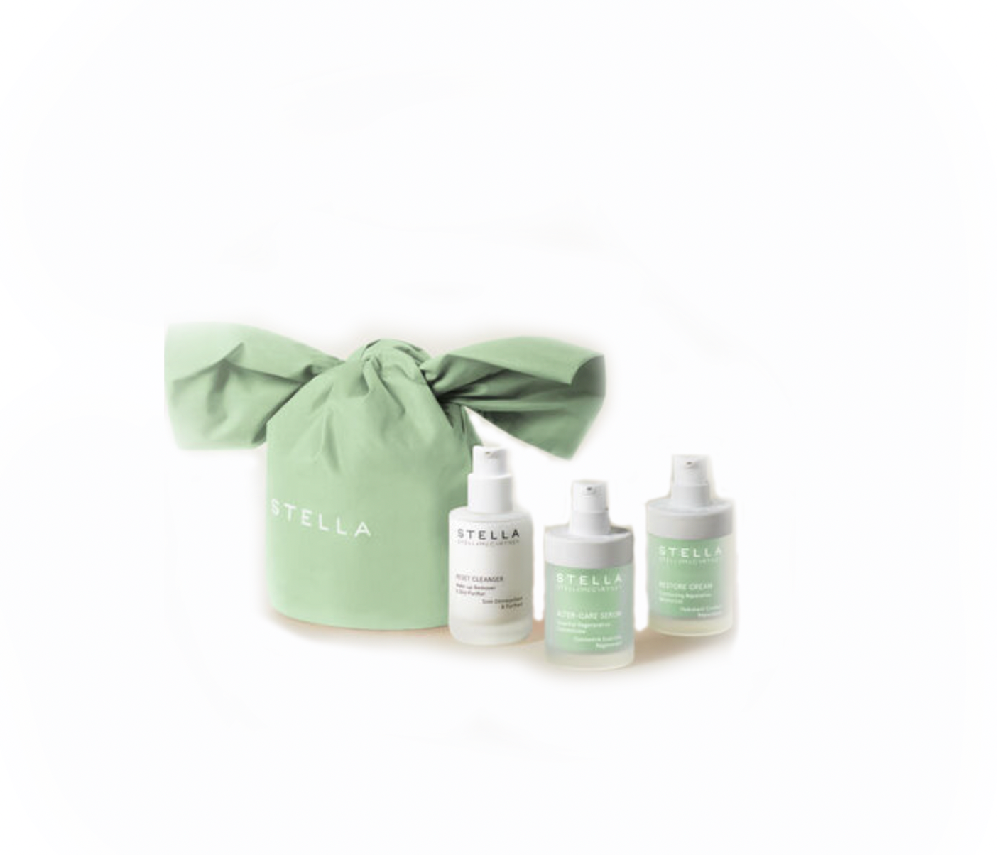 The essential Stella skincare routine: our Reset Cleanser, Alter-Care Serum and Restore Cream, housed inside an eco-designed travel bag, designed by Stella McCartney and made from recycled nylon. Vegan. Cruelty-Free. Above 99% of natural-origin ingredients for each product. All skin types.