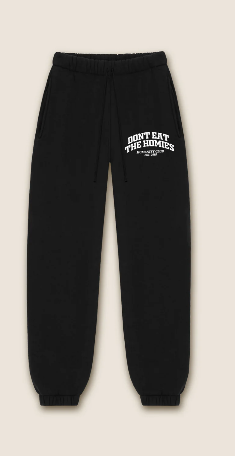 Perfect for lounging or on the go. Our 100% cotton super soft heavyweight fleece sweatpants feature an encased elastic waistband with drawstring, side seam pockets, and signature Don't Eat The Homies university decoration. Fit: men's true to size/women oversized.